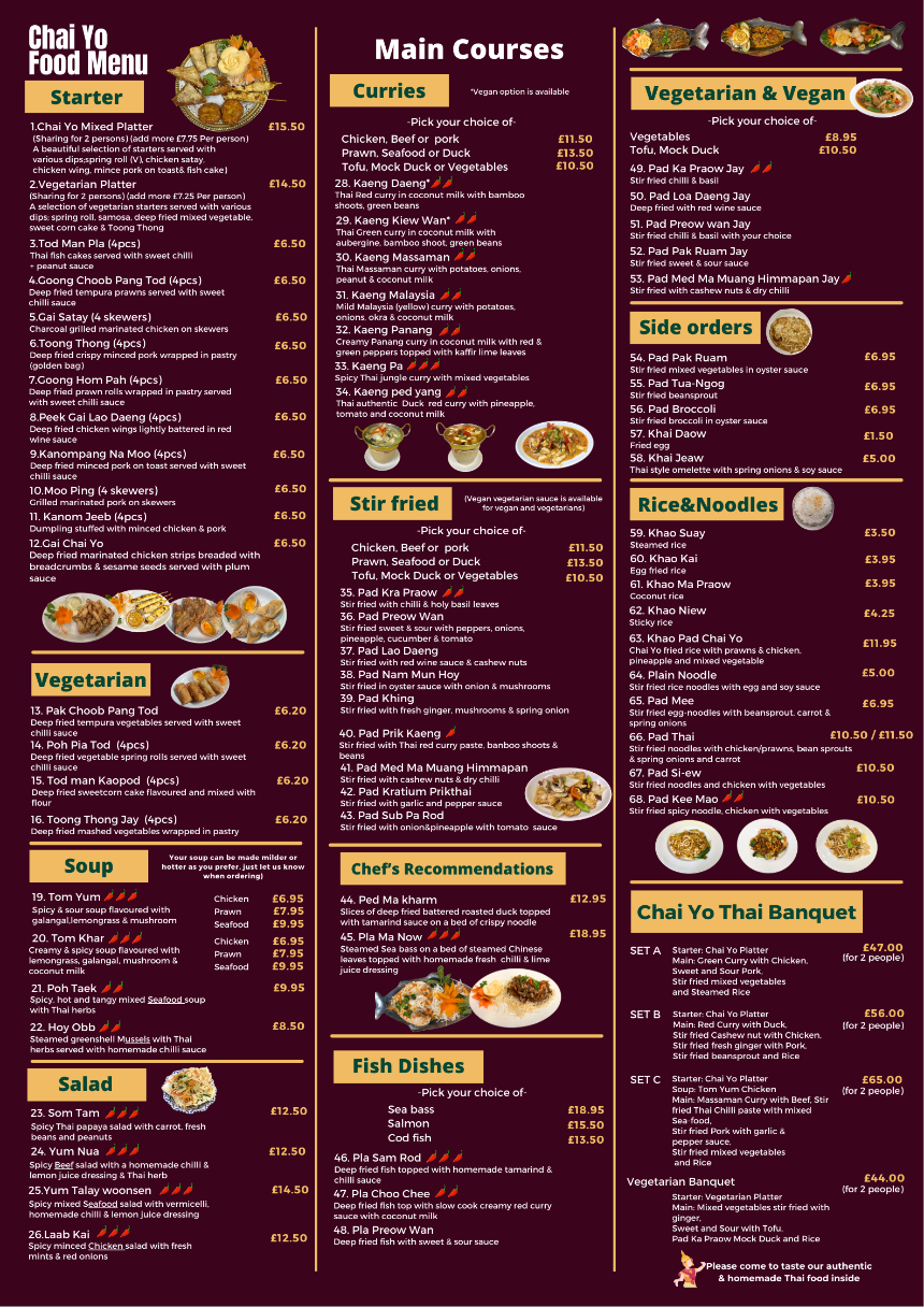 1 Chai Yo Platter (Sharing for 2 persons or more @ £7.75/person)        £15.50